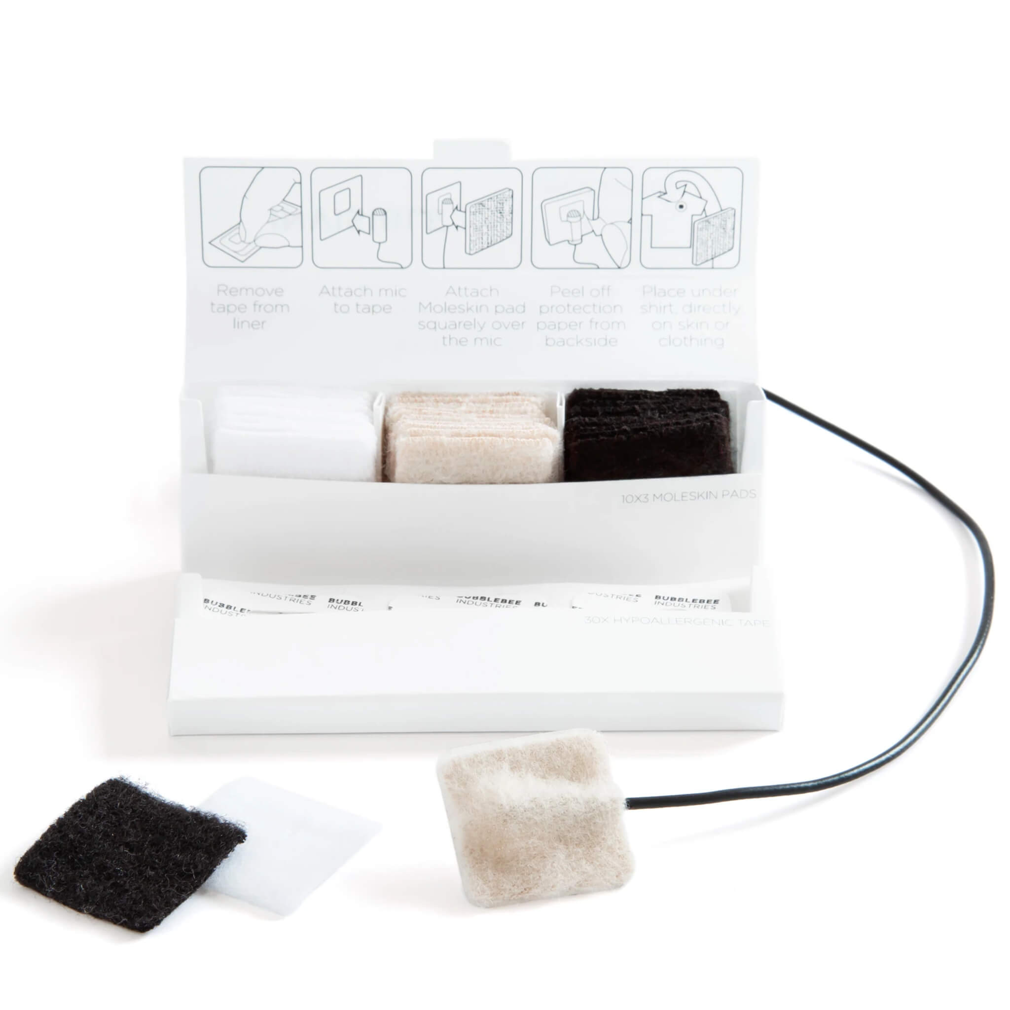 The Invisible Lav Covers - Moleskin offers a low-profile option to easily mount and hide your lavalier microphones directly on the skin or on clothes, drastically reducing friction noise whilst maintaining a high level of frequency transparency.